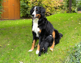 Doch nicht nur äußerlich ist der Berner eine Schönheit, auch sein Wesen zeichnet sich durch hervorragende Eigenschaften aus. Er liebt sein Rudel und alles was dazu gehört. Dabei ist er dem Menschen sehr freundlich gesonnen und wird weder ungeduldig noch rechthaberisch oder aufdringlich. Gegenüber Kindern zeigt der Berner eine geradezu engelhafte Geduld und lässt sich ohne Murren fast alles gefallen. Auch Fremde toleriert er solange sie ihn und seine Familie tolerieren. Er ist der geborene Schutzhund. Aber er bleibt dabei doch meist gelassen und friedlich. Der Berner sollte genügend Bewegung haben. Außerdem fühlt er sich in einer Familie wohl, die er auf Spaziergängen umkreisen und wie eine Herde zusammen halten kann. Er stellt an seine Haltung wenig Ansprüche, sein Fell braucht nur ein bis zweimal in der Woche gebürstet werden. Bei liebevoller und konsequenter Erziehung vom Welpenalter an, wird er der treuste Gefährte, den man sich vorstellen kann. |